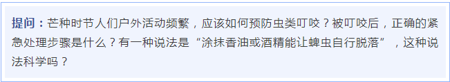 芒種時(shí)節(jié)戶外活動(dòng)需要警惕蚊蟲、蜱蟲、恙螨和隱翅蟲等侵襲。蜱蟲吸附皮膚,吸血后體積非常大,往往超過它們身體的5倍以上,它的唾液里往往攜帶多種導(dǎo)致萊姆病、森林腦炎、發(fā)熱伴血小板減少綜合征等疾病的病原體;恙螨幼蟲藏在草葉腐土中,人被叮咬后,皮膚上會(huì)形成綠豆大小的紅腫水泡,中間可能有焦痂;隱翅蟲體液接觸皮膚會(huì)引起條狀潰爛。這些蟲子在氣溫25攝氏度、濕度80%的潮濕環(huán)境中最活躍,尤其喜歡棲息在高草區(qū)、灌木叢和積水附近。