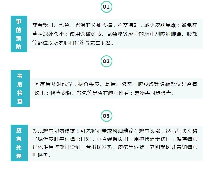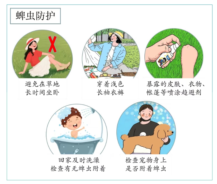 蜱蟲叮咬多發(fā)生于春夏季(4-10月),因南方濕熱的氣候,蜱蟲活躍期相對比北方更長。市民享受美妙的草坪時光的同時,建議采取以下防護措施: